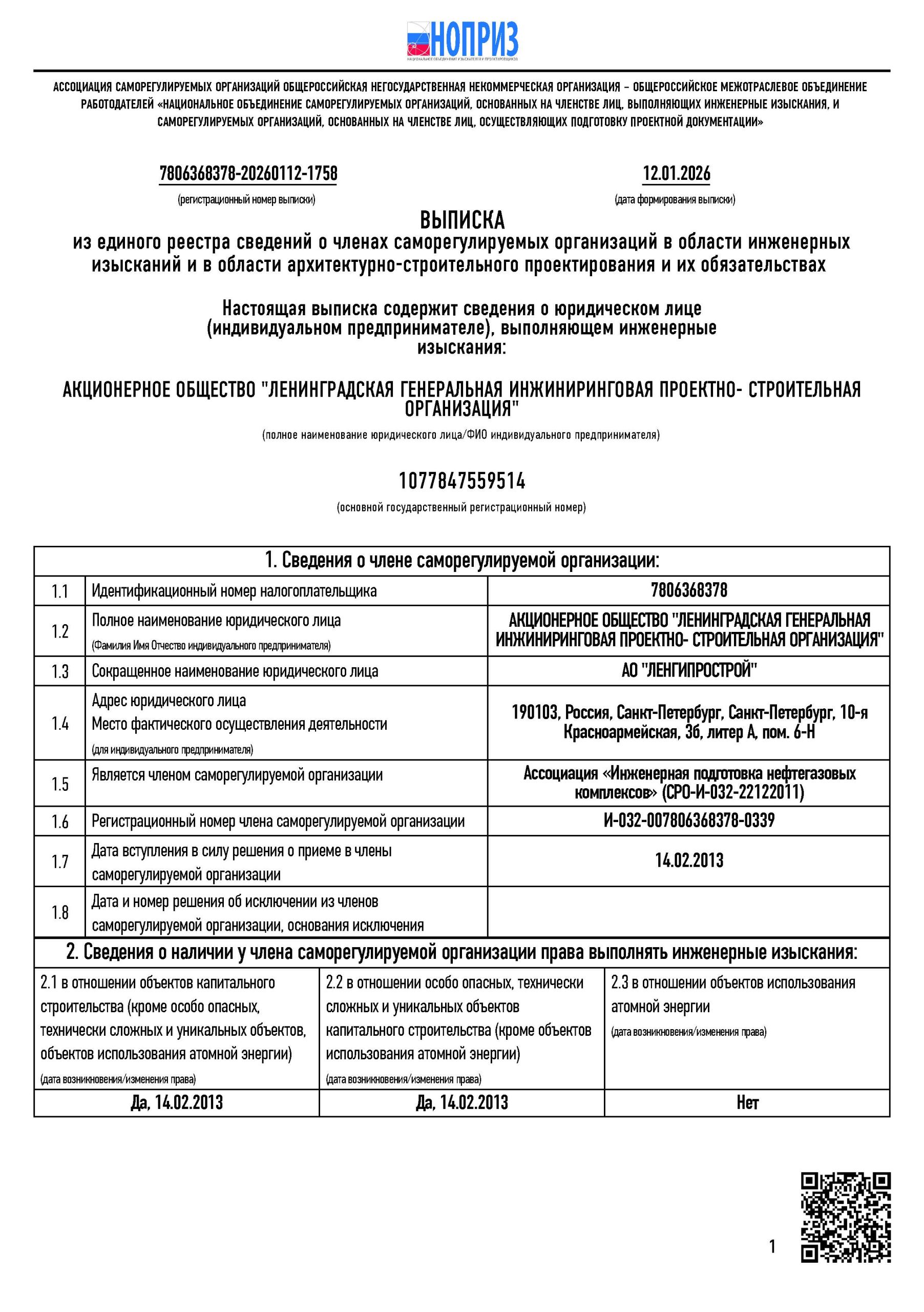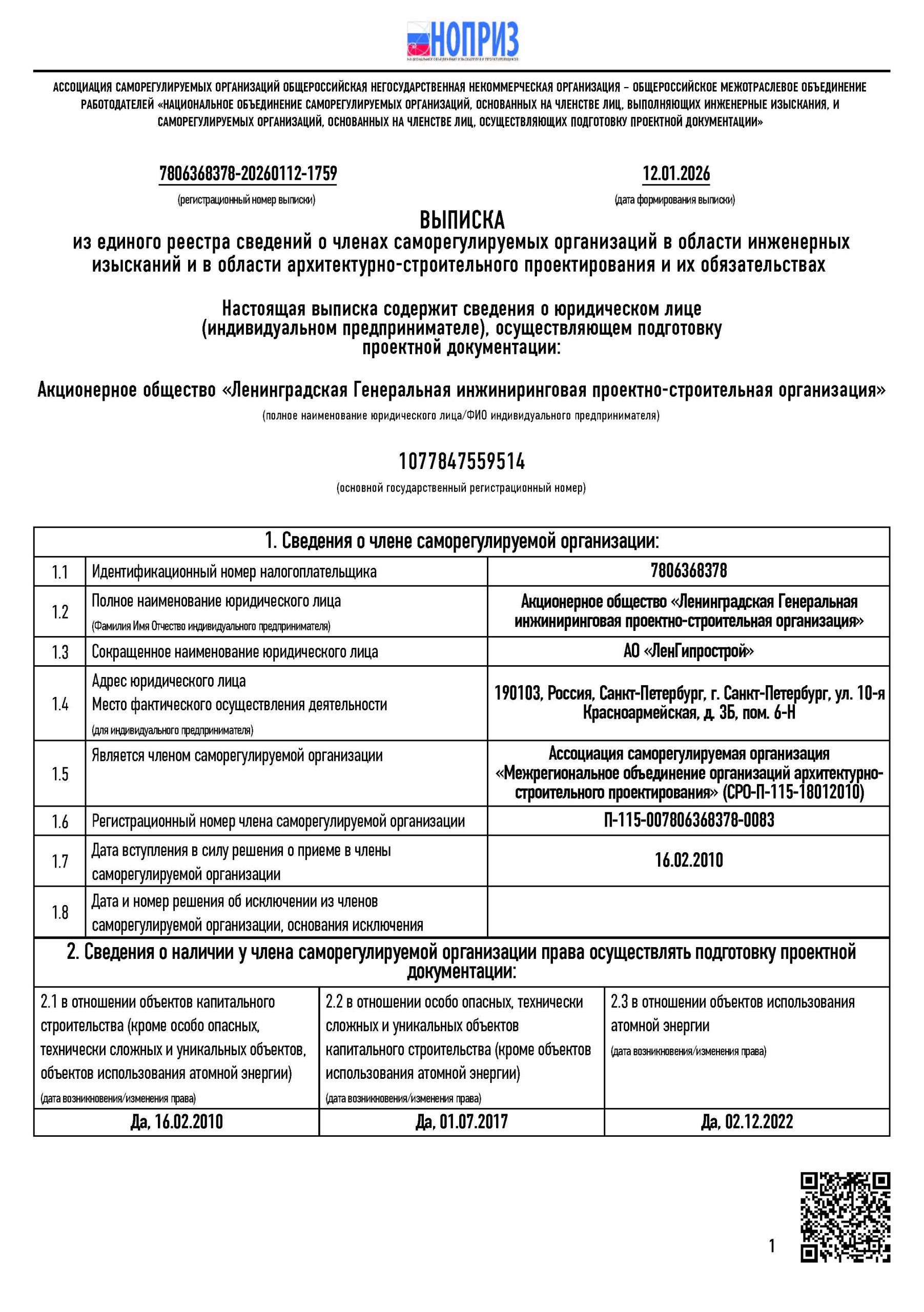 Инженеры компании включены в национальный реестр специалистов в области инженерных изысканий и архитектурно-строительного проектирования Ассоциации СРО «НОПРИЗ» и в национальный реестр специалистов в области строительства Ассоциации «Национальное объединение строителей» («НОСТРОЙ»).